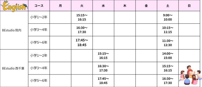| 小学3~4年生コース | 火曜 16:30~17:30 土曜 10:15~11:15 |